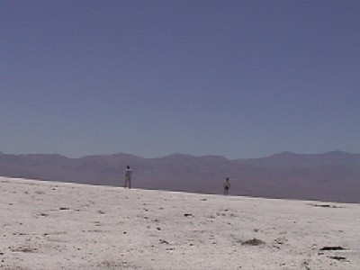 | 砂漠の真中に干上がった湖:ドライレイクが点在する。車から降り、白く光る湖に入る。 |