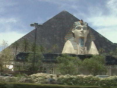 | ラスベガスには派手なホテルが多い。最たるものは、昨日もシルエットの見えたここ、ルクソールホテル。ラスベガスの中心からは若干離れている。 |