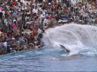 シャチが飛んだり、人を乗せるのは同じだが、シャチに勢いをつけてプールサイドに投げ出されたトレーナーのお兄さんが、滑って止まれず、別のお兄さんを突き飛ばしたり、ひれを使って大量の水(ホント半端ではない)を客席に浴びせたりしている。