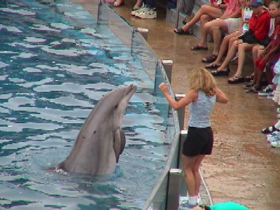ショーが始まる。イルカのジャンプなどは鴨川も引けを取らないカンジ。しかし、観客から選ばれた小さい女の子がイルカに「回れ」とやらせたり、ご褒美のお魚をあげて匂いをかがせ「くさい」と言わせたり、で「最後に記念撮影をしますよ」といってカメラを持った普通の服を着たお姉さんが足元を踏み外してプールに落下、イルカが救い出すというハプニング(演技)があったりと、客を楽しませることに事欠かない。でもまた観客に水を浴びせている。客も喜んでるし。。以前に行ったNutt's Berry Farmの時といい。。。。うーむ。
