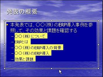 追加されたスライドに、タイトルや本文を入力(以下は「発表の概要」の作成例)。