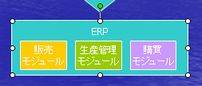複数の図形をひとつの図形としてまとめて扱いたいとき、グループ化しておくと便利である。例えば、ERP、販売モジュール、生産管理モジュール、購買モジュールと記入された四角形の図形をグルーピングしたい場合、それらすべてを四角形の枠で取り囲むイメージで、図形が何もないところでマウス右ボタンを押し(下図a)、押したまま右下へ移動する(下図b)。マウス右ボタンを放すと、すべてが選択された状態になる(下図c)。