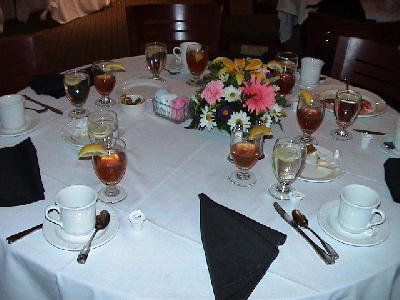 学長や教授らの話を聞きながらすばらしい食事を堪能する。われわれのテーブルにはファン先生が。写真は食後のテーブル。