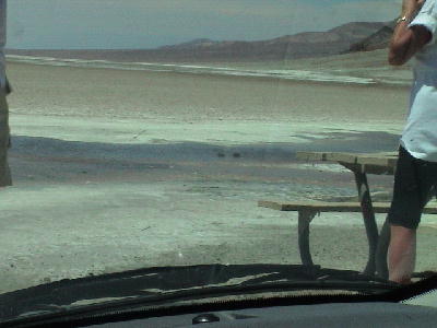 | 砂漠の真中に干上がった湖:ドライレイクが点在する。車から降り、白く光る湖に入る。 |