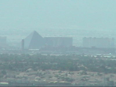 | ラスベガスには派手なホテルが多い。最たるものは、昨日もシルエットの見えたここ、ルクソールホテル。ラスベガスの中心からは若干離れている。 |