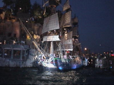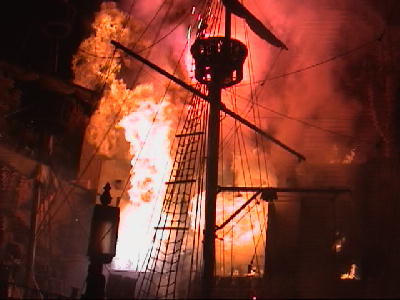 | タダだからとそれほどの期待はなかったが、タダとは思えないほどの金のかけよう。海賊船に軍隊?の大砲が命中。派手に爆発、炎上する。炎の迫力と熱気に歓声が沸く。 |