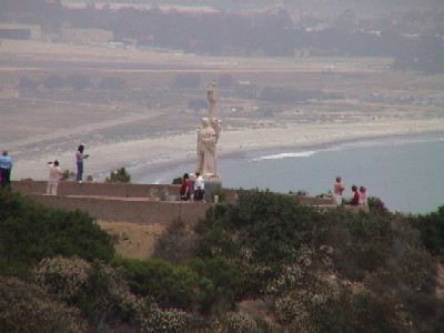 | 少し灯台のあるほうに移動して振り返る。Cabrillo像の向こうにSanDiego湾、Coronadaのビーチが見える。