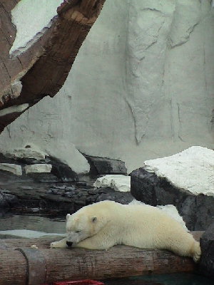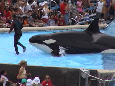 ショーが始まる。イルカのジャンプなどは鴨川も引けを取らないカンジ。しかし、観客から選ばれた小さい女の子がイルカに「回れ」とやらせたり、ご褒美のお魚をあげて匂いをかがせ「くさい」と言わせたり、で「最後に記念撮影をしますよ」といってカメラを持った普通の服を着たお姉さんが足元を踏み外してプールに落下、イルカが救い出すというハプニング(演技)があったりと、客を楽しませることに事欠かない。でもまた観客に水を浴びせている。客も喜んでるし。。以前に行ったNutt's Berry Farmの時といい。。。。うーむ。