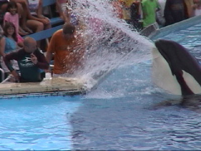 シャチが飛んだり、人を乗せるのは同じだが、シャチに勢いをつけてプールサイドに投げ出されたトレーナーのお兄さんが、滑って止まれず、別のお兄さんを突き飛ばしたり、ひれを使って大量の水(ホント半端ではない)を客席に浴びせたりしている。