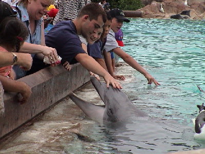 | シャムーのショーが終わり、次のイベントはイルカのショー。15分後。この間に水族館やその他のアトラクションをチェック。イルカのプールでは、自由にイルカに触ったり餌付け(餌は有料)をしたりすることができる。